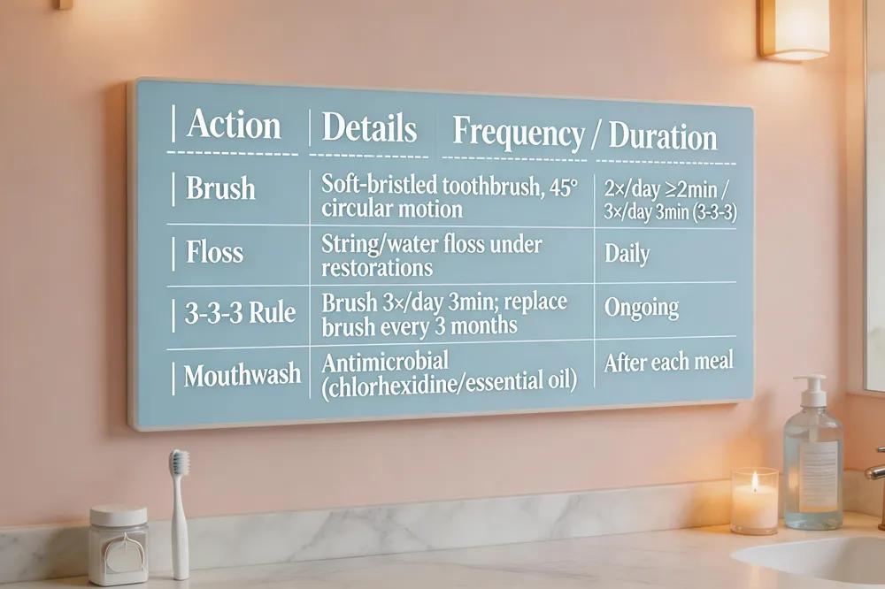Mouthwash adds an extra defense. Use an antimicrobial mouthwash (e.g., chlorhexidine or essential‑oil based) after meals to lower bacterial load while protecting restorations.