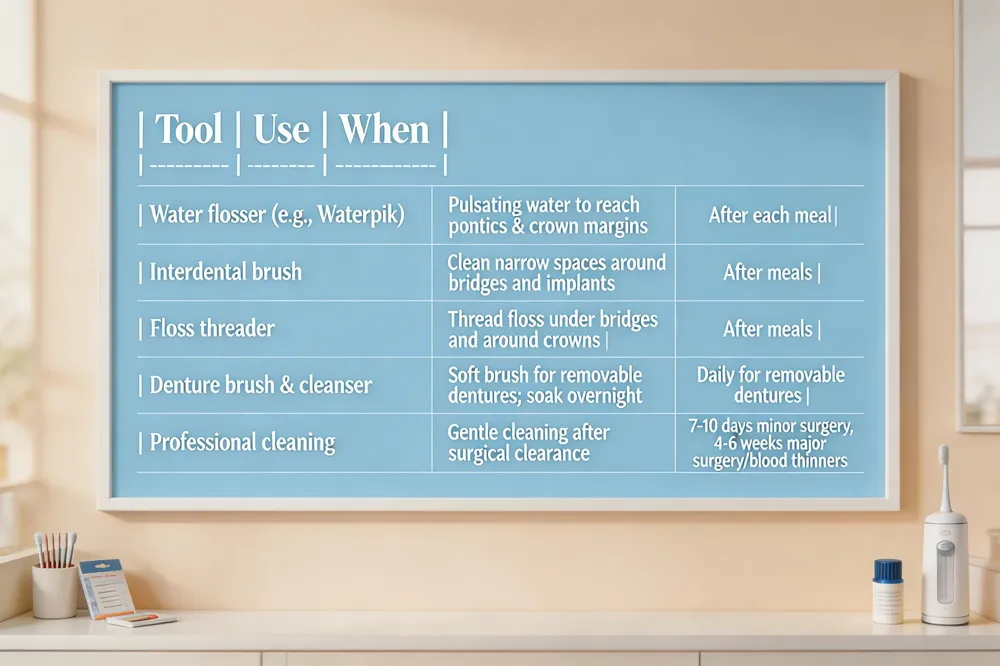 Water flossers and small brushes are gentle, effective ways to reach under crowns, around bridges, and along implant margins where a regular toothbrush can’t. The pulsating stream of water dislodges food particles, while thin bristles clean narrow spaces without damaging delicate restorations.