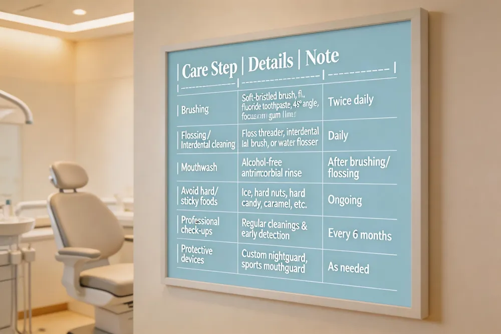 Maintaining crowns and bridges is essential for a lasting smile. How do you take care of crowns and bridges? Brush twice a day with a soft‑bristled toothbrush and fluoride toothpaste, paying special attention to the gum line. Use a floss threader, interdental brush, or water flosser daily to clean beneath a bridge and around a crown. Rinse with an alcohol‑free antimicrobial mouthwash to keep plaque at bay. Avoid chewing very hard foods—ice, nuts, hard candy—and sticky items like caramel that can chip or loosen restorations. Schedule regular dental check‑ups for professional cleanings and early problem detection.