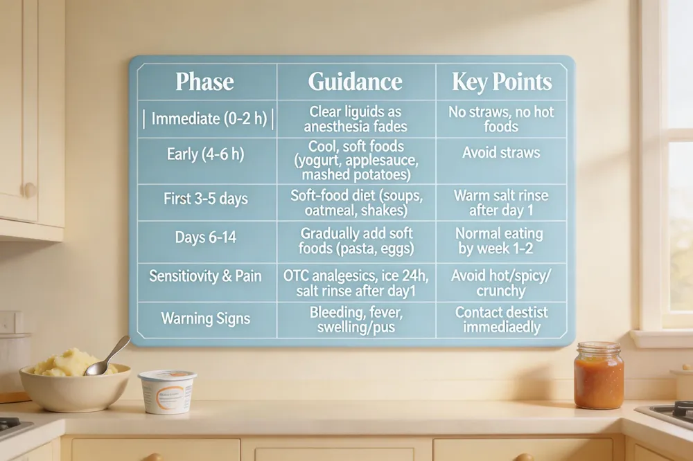 After oral surgery: when can I eat? – Clear liquids soon after anesthesia, soft cool foods after 4‑6 hours, soft‑food diet for 3‑5 days, then gentle regular foods by week one.