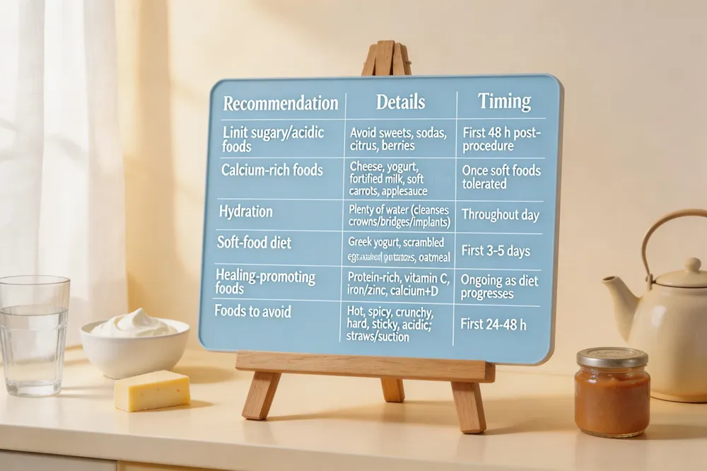 Sugary and acidic food limitations – Limit sugary foods and beverages, such as sweets, sodas, citrus, and berries, for at least the first 48 hours to prevent acid‑driven enamel erosion and clot dislodgement.