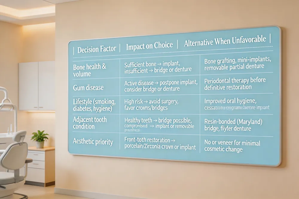 When choosing a restoration, dentists weigh bone health, gum disease, lifestyle, and aesthetics. Adequate bone and healthy gums are essential for implants; insufficient bone may require grafting or make a bridge a safer choice. Active smokers, uncontrolled diabetes, or poor oral hygiene can also steer patients away from surgery toward crowns or bridges.