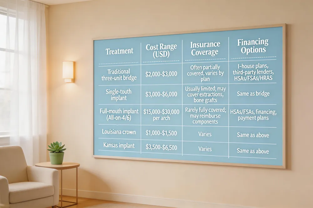 When deciding between a crown, bridge, or implant, understanding the financial landscape is essential. A traditional three‑unit bridge typically costs between $2,000 and $3,000, while a single‑tooth implant ranges from $3,000 to $6,000. Full‑mouth implant solutions can exceed $20,000, often approaching $30,000‑$60,000 for All‑on‑4 or full‑arch restorations. Insurance coverage varies: many plans cover a portion of bridge work, but implants are frequently classified as cosmetic and receive limited reimbursement. However, dental insurers may subsidize extractions, bone grafts, or the surgical placement of implants; always verify benefits before treatment. Financing options include in‑house payment plans, third‑party lenders, and tax‑advantaged accounts such as HSAs, FSAs, or HRAs. Regional pricing differences are notable—Louisiana crowns average $1,000‑$1,500, Kansas implants $3,500‑$6,500, and Wichita implants $3,000‑$7,000. For a single‑tooth implant, the national average is about $2,143, with crowns adding $488‑$3,254. At Loud Family Dental, we work with insurers and offer flexible financing to help you achieve a healthy, confident smile without compromising your budget.
