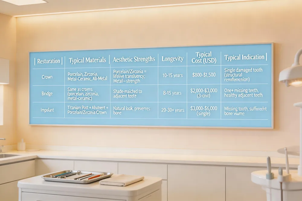 Longevity and maintenance – With good oral hygiene, crowns last 10‑15 years, bridges 8‑15 years, and implants 20‑30 years or a lifetime. Regular cleanings, flossing (or floss threaders for bridges) and avoiding smoking help all restorations stay healthy.