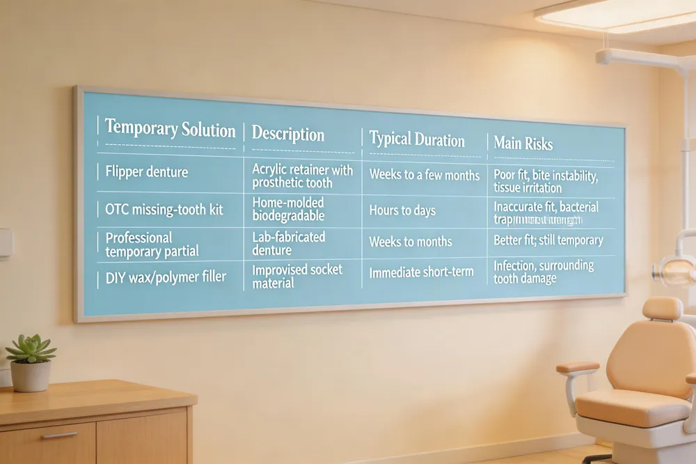 Short‑term fixes such as a professionally made flipper or a temporary partial denture can bridge the gap while you plan definitive treatment. Keep the area clean with gentle brushing and salt‑water rinses, and stick to soft foods to avoid dislodging the temporary tooth.