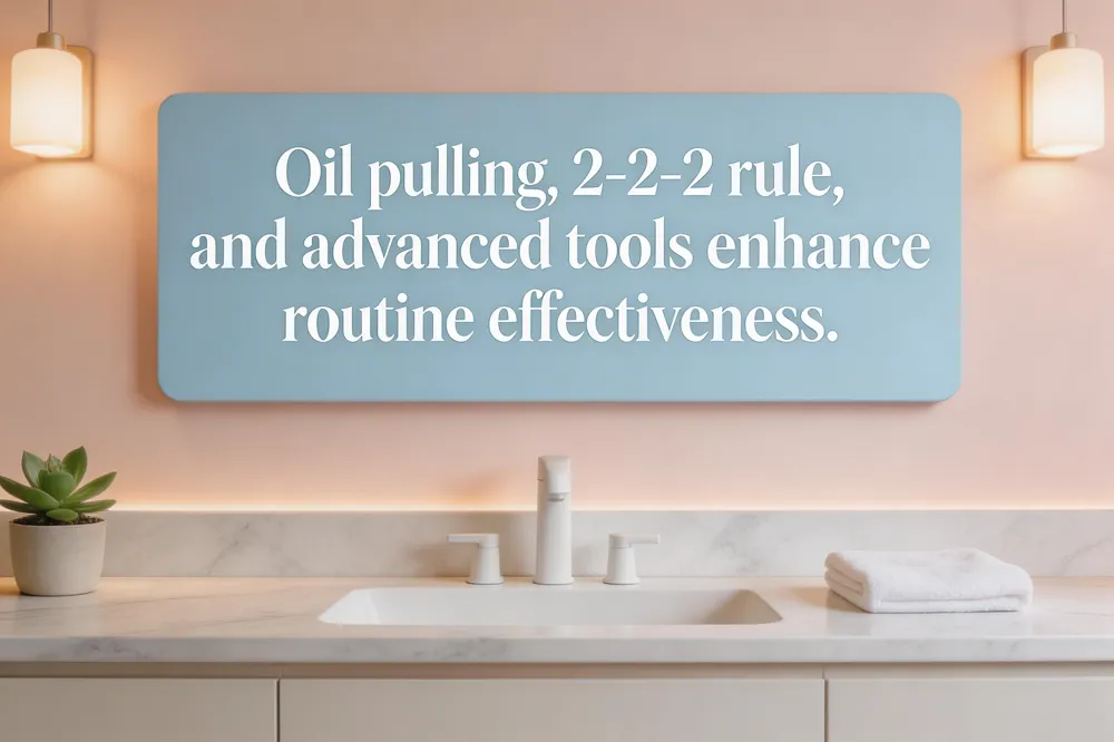 Start your morning by scraping the tongue with a metal scraper to remove the overnight bacterial film. If you use oil pulling, swish a tablespoon of coconut or sesame oil for 5–10 minutes, then spit it into the trash and rinse the mouth with water. Follow with flossing or interdental cleaning to dislodge plaque from between the teeth. Brush your teeth for a full two minutes using a soft‑bristled brush and fluoride toothpaste in gentle circular motions. Rinse with an alcohol‑free antibacterial mouthwash and finish with a fluoride rinse for extra protection. Avoid eating or drinking for at least 30 minutes to let the fluoride work.