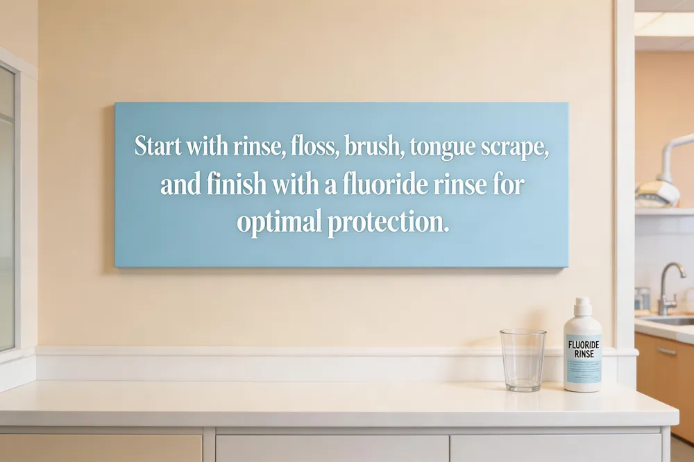 Oral hygiene routine order – Rinse → floss → brush → tongue scrape → final rinse. This sequence maximizes plaque removal, fluoride contact, and breath freshening for a healthier smile.
