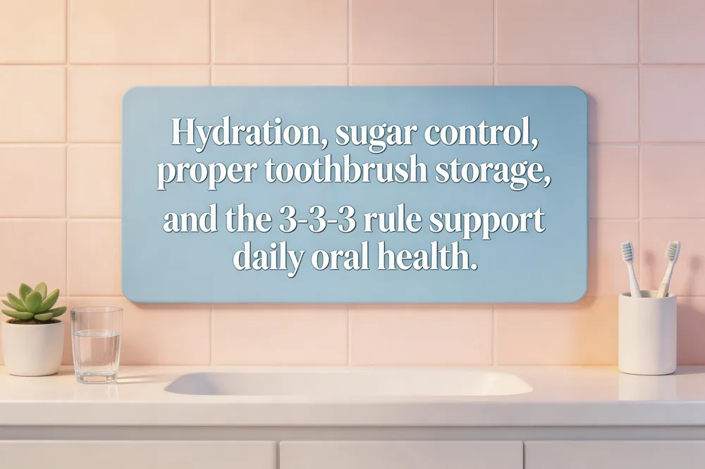 - Limit sugary and acidic foods/drinks; rinse with water after consumption and wait 30–60 minutes before brushing acidic foods.