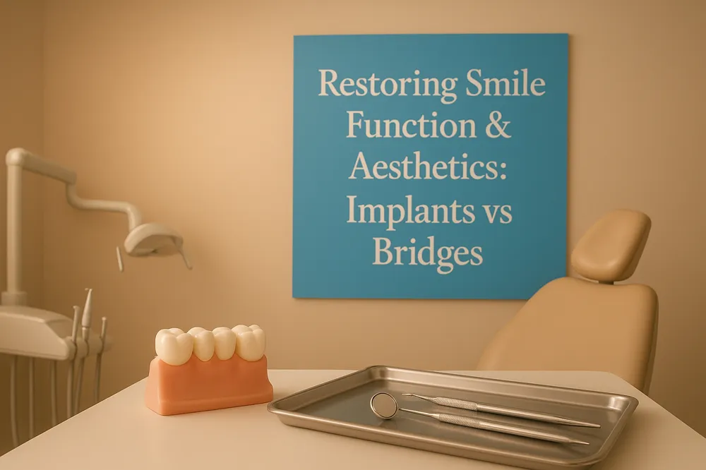 Overall, implants offer better long-term function and aesthetics, with easier hygiene and greater comfort, whereas bridges offer a quicker, less invasive solution with effective but somewhat limited functional and aesthetic restoration. For a comprehensive overview see Choosing between dental bridges and implants.