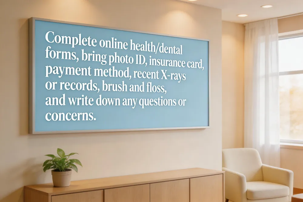 Arriving 10‑15 minutes early, bringing a photo ID, insurance card, and any recent dental records will help the visit run smoothly and reduce anxiety.