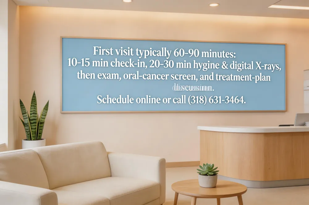 Loud Family Dental designs the first‑visit experience to be thorough yet efficient. A typical new‑patient appointment lasts about 60 to 90 minutes. The first 10‑15 minutes are reserved for check‑in, verification of insurance, and completion of any remaining paperwork. Next, the dental hygienist performs a comprehensive oral exam, records periodontal measurements, and takes digital X‑rays (which use low radiation). This clinical data collection usually takes 20‑30 minutes. The dentist then reviews the findings, conducts a visual examination, screens for oral cancer, and discusses your oral‑health goals, ending with a personalized treatment plan. Most patients finish within the one‑hour‑to‑one‑and‑a‑half window, though more complex cases may require extra time.