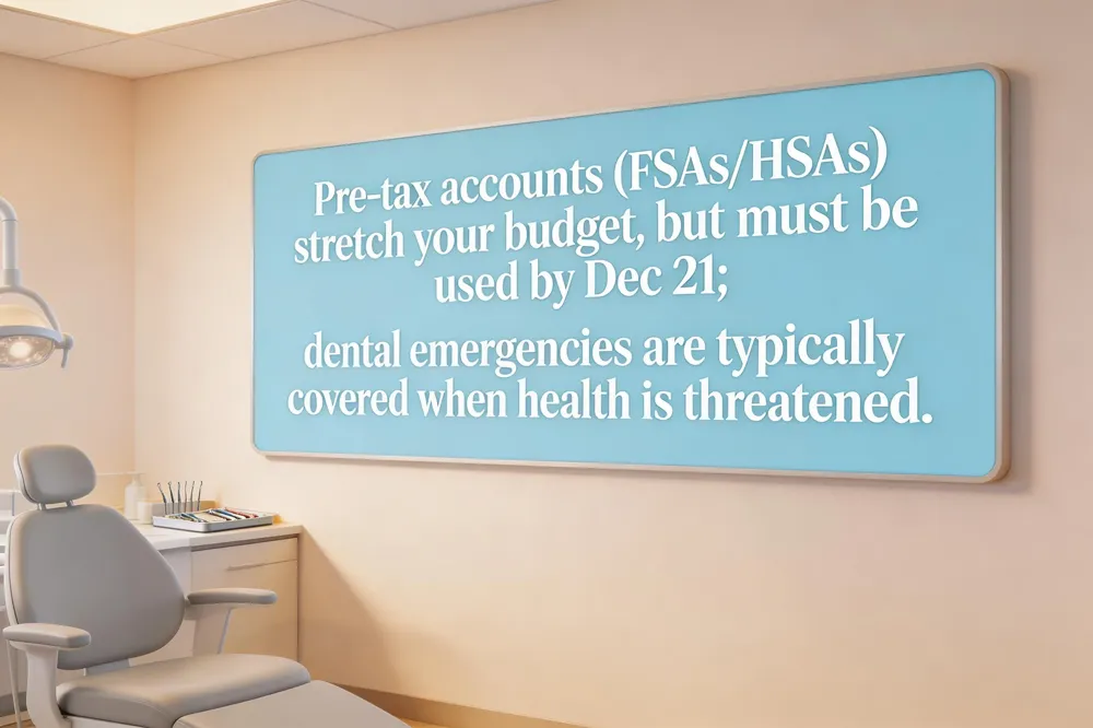 Flexible Spending Accounts (FSAs) and Health Savings Accounts (HSAs) let you pay for dental expenses with pre‑tax dollars, stretching your budget and reducing taxes. They usually require that the money be spent by December 31, making year‑end appointments a smart way to use both insurance and tax‑advantaged funds.