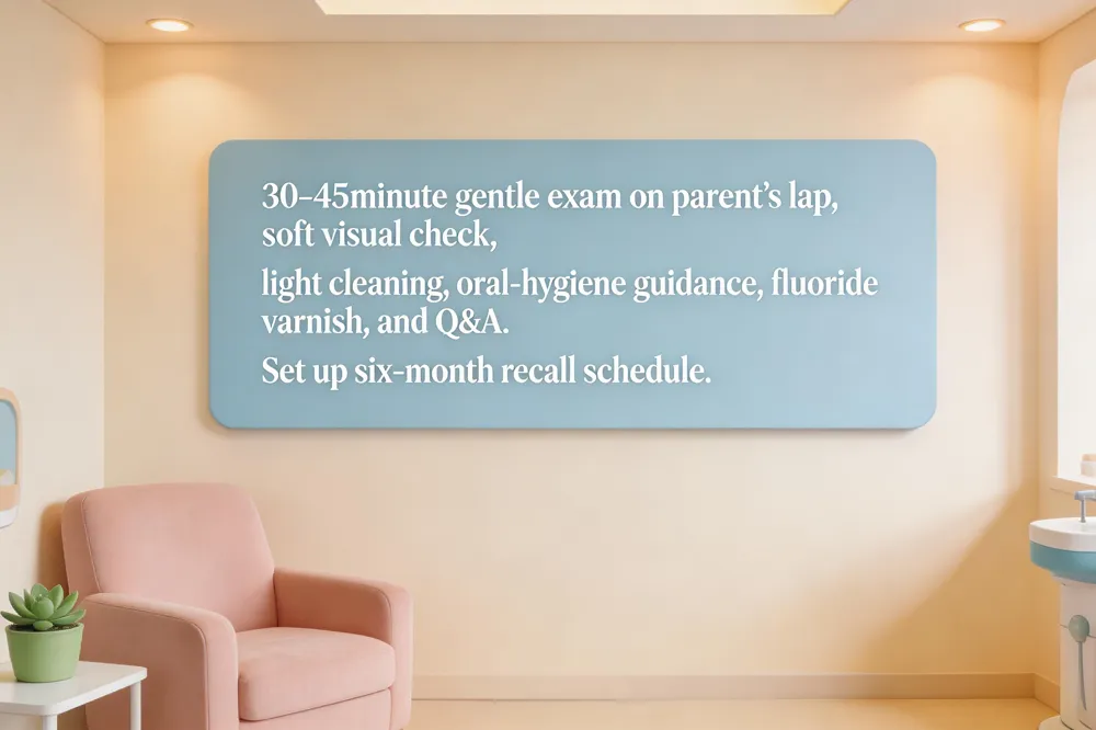 The first dental visit for a baby usually lasts 30‑45 minutes and is designed to be gentle and reassuring. The dentist will perform a soft visual exam of the gums, any erupted teeth, and the jaw, often with the child on a parent’s lap. A light cleaning is done with a tiny brush or gauze to remove plaque and to show how to wipe gums before teeth appear. Parents receive clear oral‑hygiene guidance: use a soft‑bristled brush, apply a rice‑grain‑size amount of fluoride toothpaste when the first tooth shows, switch to a pea‑sized amount after age three, limit sugary drinks, and learn best practices for pacifier or bottle use. Fluoride treatment is safe and highly recommended; a low‑concentration varnish applied by the dentist strengthens enamel and reduces decay risk, especially for high‑risk children. The clinician will answer any questions, discuss teething comfort, and set a schedule for six‑month check‑ups to keep the child’s smile healthy and confident.