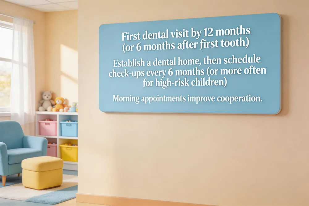 Children should have their first dental visit by 12 months of age, or within six months after the first tooth erupts. This early appointment establishes a “dental home,” lets the dentist check oral development, and provides fluoride guidance to prevent early decay. After the initial exam, the dentist typically recommends a check‑up every six months (or more often if the child is at high risk). Regular six‑month visits allow the professional to monitor tooth eruption, apply preventive treatments, and reinforce brushing and nutrition habits.