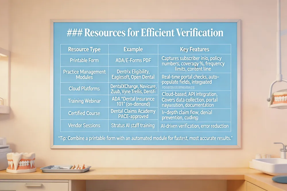 Training resources are widely available. The ADA’s on‑demand "Dental Insurance 101" webinar, Dental Claims Academy’s PACE‑approved course, and vendor‑provided sessions (e.g., Stratus AI) teach front‑office staff how to collect the right information, navigate payer portals, and document verification results. These low‑cost or free programs can be accessed online at any time, helping teams stay current on ever‑changing dental benefit rules.