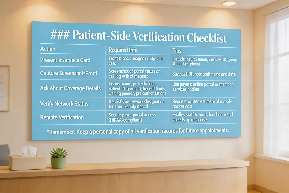 When you need to verify health insurance for a dental visit, gather your member ID, group number and insurer’s phone number, then either Check eligibility through payer’s online portal or toll‑free number or call the member‑services line. Ask specifically about dental benefits, in‑network status for Loud Family Dental, any waiting periods, and required pre‑authorizations. Keep a copy of the verification for your records.