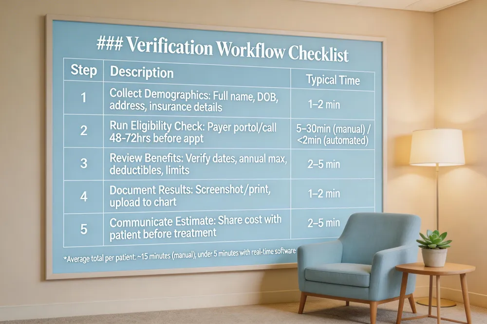 Dental offices follow a clear workflow to confirm a patient’s insurance before treatment. Workflow and timing – staff collect the patient’s full name, DOB, address and and every card details, then run a verification at least 48–72 hours before the appointment; a real‑time check is done at check‑in if needed. Typical checklist items include core demographics, primary and secondary carrier names, member and group numbers, effective dates, annual maximums, remaining benefits, coverage percentages for preventive, basic and major services, deductible status, waiting periods, frequency limits, and any pre‑authorization or referral requirements. Time required – manual phone or portal checks usually take 5–30 minutes per patient, averaging about 15 minutes, while automated eligibility software can return results in under two minutes, often in seconds. Step‑by‑step online verification: 1) Log into the payer’s portal with practice credentials; 2) Enter the patient’s name, DOB, member ID and any group numbers; 3) Review the eligibility screen for active coverage, benefit limits, and authorizations; 4) Capture a screenshot or printed copy, noting date, time and staff name; 5) Record the summary in the patient’s chart and share a clear cost estimate with the patient. By following these steps, offices reduce claim denials, improve cash flow, and keep patients informed about their out‑of‑pocket responsibilities.