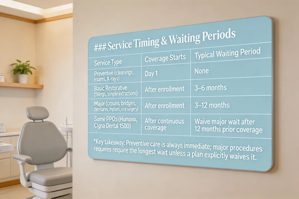 Getting coverage right before a procedure can feel urgent, but most dental plans impose waiting periods that dictate when specific services become payable. Preventive care—cleanings, exams, X‑rays— is usually covered from day one, so you can schedule those visits immediately. Basic restorative work such as fillings often has a short three‑to‑six‑month wait, while major services like crowns, bridges, dentures, implants, or oral surgery may require three months to a full year before the insurer pays its share.