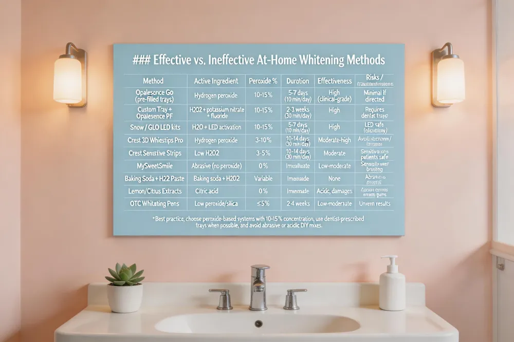 At‑home whitening is safe and effective when you follow dentist‑approved protocols, but many DIY myths—such as baking‑soda‑and hydrogen peroxide or lemon juice—are not enamel‑safe and can cause gum irritation. True whitening cannot be achieved in two minutes; even the fastest LED‑activated tray kits need 10‑15 minutes per session and several days of repeated use to show a shade change. The quickest reliable results come from peroxide‑based systems like Opalescence Go, Snow, or GLO, which use 10‑15 % hydrogen peroxide gels and include an LED light to speed the reaction. Users typically notice a brighter smile after 5‑7 days of daily 10‑minute treatments. For those with sensitivity, choose lower‑concentration formulas with potassium nitrate or xylitol, and maintain with a gentle whitening toothpaste such as Supersmile or Crest 3D White Brilliance. Strips (e.g., Crest 3D White Whitestrips 1‑Hour Express) are convenient, applied 30 minutes daily for one to two weeks, but avoid using them on crowns, veneers, or braces. Consult your dentist before starting any regimen to protect enamel and ensure optimal results. Complement the whitening routine with brushing, flossing, and dental cleanings to preserve the new shade.