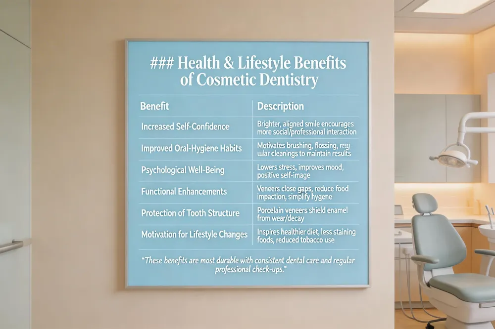Self‑confidence impact – A brighter smile from professional whitening or porcelain veneers often leads patients to smile more often, engage socially, and feel more positive about daily interactions.