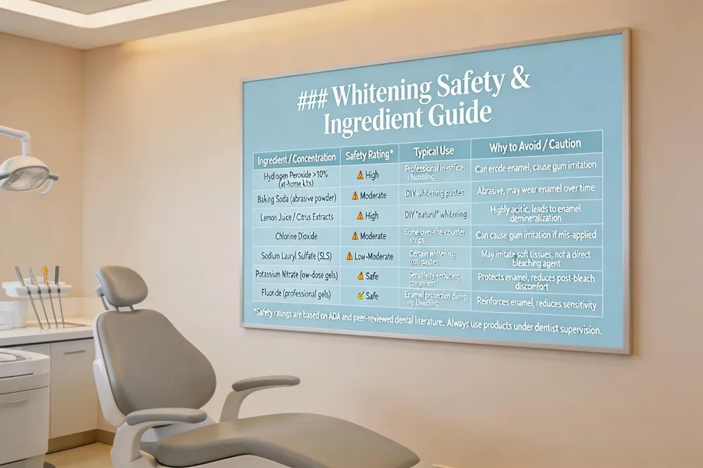 Ingredients to avoid are high‑concentration hydrogen peroxide (>10 % for at‑home kits), abrasive powders like baking soda, acidic additives (lemon juice, citrus extracts), chlorine dioxide, and sodium‑typeyl‑sulfate (SLS), all of which can damage enamel or irritate gums.