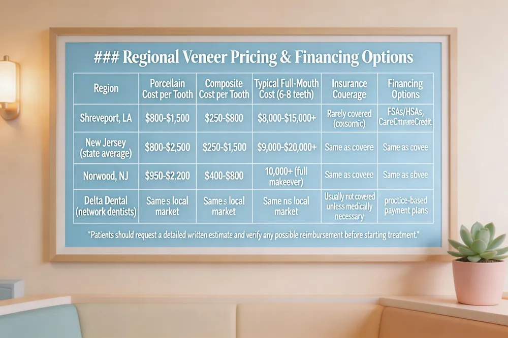 Dental veneer prices differ widely across the United States. In New Jersey a single porcelain veneer can cost $900‑$2,500 with E‑Max and zirconia options ranging from $600‑$2,200. Composite veneers are cheaper ($250‑$1,500) but last shorter. In Norwood, NJ the same porcelain range is $950‑$2,200 per tooth and a full‑mouth makeover can exceed $10,000, while laminate veneers start around $400‑$800. Most insurance plans treat veneers as cosmetic, so coverage is rare unless the restoration is medically necessary (e.g., a cracked tooth). Patients can offset out‑of‑pocket costs with FSAs, HSAs, or practice financing such as CareCredit or low‑interest payment plans. For a local option, Loud Family Dental in Shreveport, LA offers custom porcelain and composite veneers, a digital smile preview, and flexible financing to make a smile makeover more affordable. Always request a detailed estimate and verify any possible reimbursement before treatment.