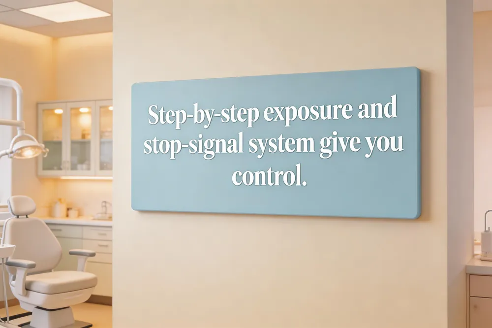 A step‑by‑step exposure with a stop‑signal system gives you control. We start with a brief office tour, then a quick, painless gum scan, pausing whenever you signal a pre‑agreed word or hand cue. Gradually, each exposure builds confidence, and the stop‑signal reassures you that you can pause the procedure at any time.