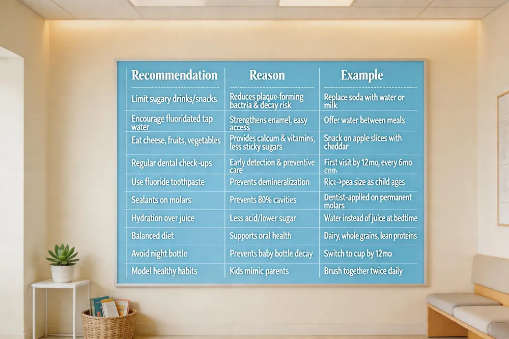 Limit sugary snacks and drinks, especially at bedtime, and transition from a bottle to a regular cup by the first birthday. Encourage water, especially fluoridated tap water, between meals. Modeling good oral habits yourself and making brushing fun with songs or timers reinforces lifelong dental health.
