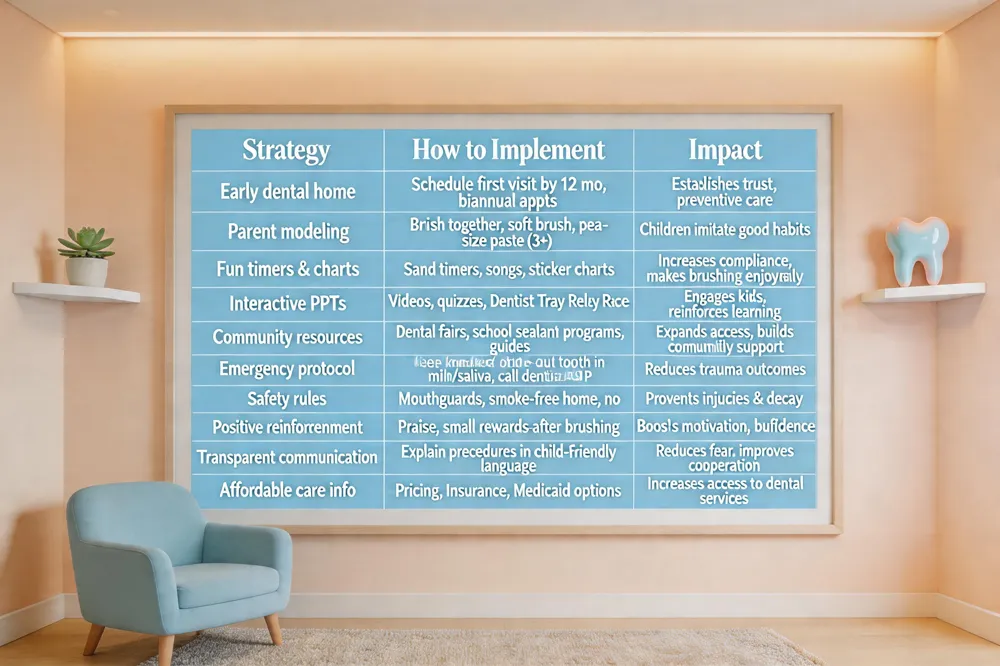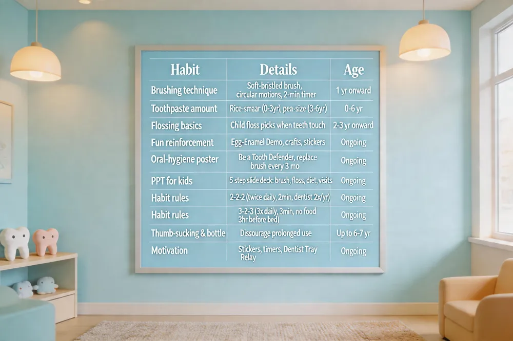 Fun activities to reinforce habits – Turn oral care into play: "Egg‑Enamel Demo" (soda stains a boiled egg tooth), "Marshmallow Mouth" craft, and "Healthy‑vs‑Unhealthy Snack Sort" games. A tooth‑brushing chart with stickers, colorful timers, and a "Dentist Tray Relay Race" keep motivation high.