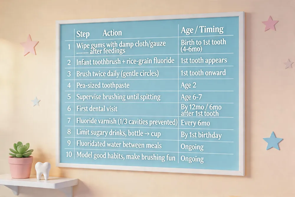 Brushing technique & toothpaste amount – When the first tooth appears, wipe gums with a damp cloth. Once teeth erupt, use a soft‑bristled brush and a smear of fluoride toothpaste (rice‑grain size) until age 3, then a pea‑sized amount. Teach circular motions on the outer, inner and chewing surfaces for a full two minutes; a timer or a favorite song helps keep the length right.