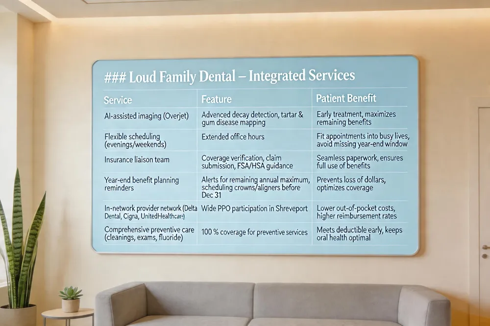 Start by reviewing your dental insurance policy—note the annual maximum, deductible, and which services are covered at 100% (usually cleanings, exams, and X‑rays). Use the online insurance‑check tool on the Loud Family Dental website to confirm network status for carriers such as Delta Dental, Cigna, UnitedHealthcare, and Aetna, and to see any remaining benefit dollars before December 31. Schedule a year‑end appointment promptly; a routine check‑up in December lets you use any leftover preventive benefits, catch early signs of plaque or cavities, and plan larger restorative or orthodontic work that can be split across two benefit years. Loud Family Dental’s staff will verify eligibility, submit claims, and provide cost estimates so you can maximize coverage, reduce out‑of‑pocket costs, and finish the year with a healthier smile.