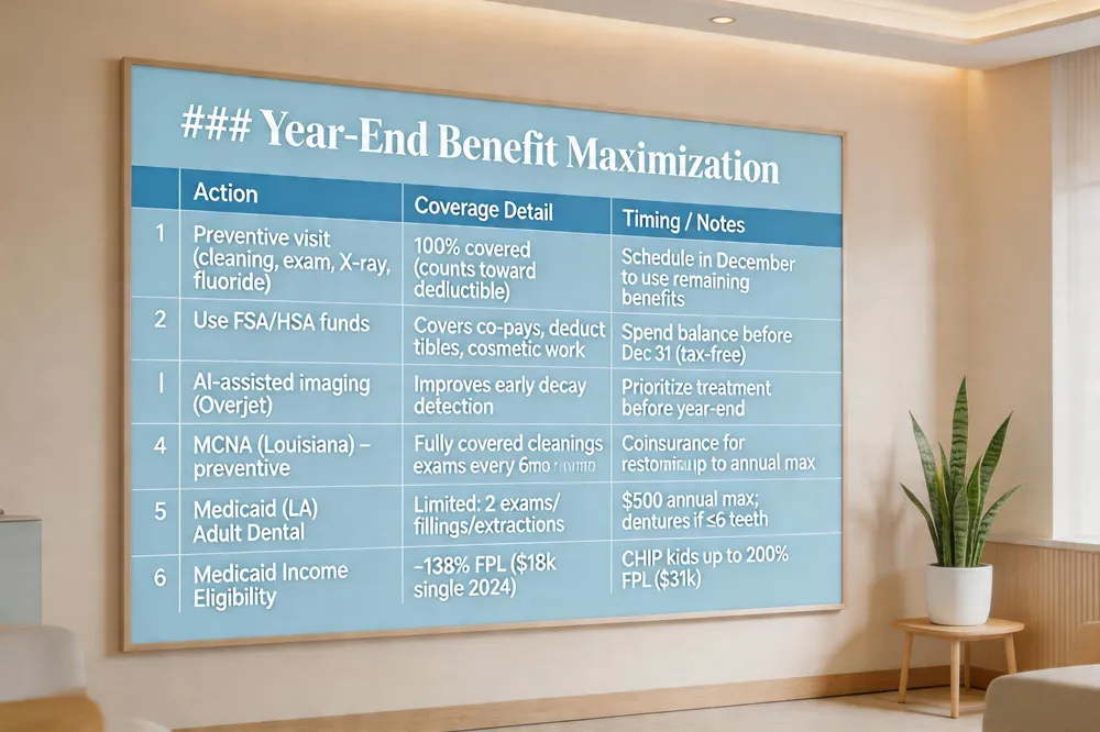 | Dental benefits reset on January 1 and expire December 31, and Unused annual maximums are lost at year‑end. To make sure every dollar counts, start by scheduling a preventive visit in December—cleanings, exams, X‑rays and fluoride treatments are usually covered at 100% and help meet your deductible early. If you have a Flexible Spending Account (FSA) or Health Savings Account (HSA), spend the remaining balance before December 31; these funds can cover co‑pays, deductibles, or even cosmetic work that your plan doesn’t fully reimburse. |