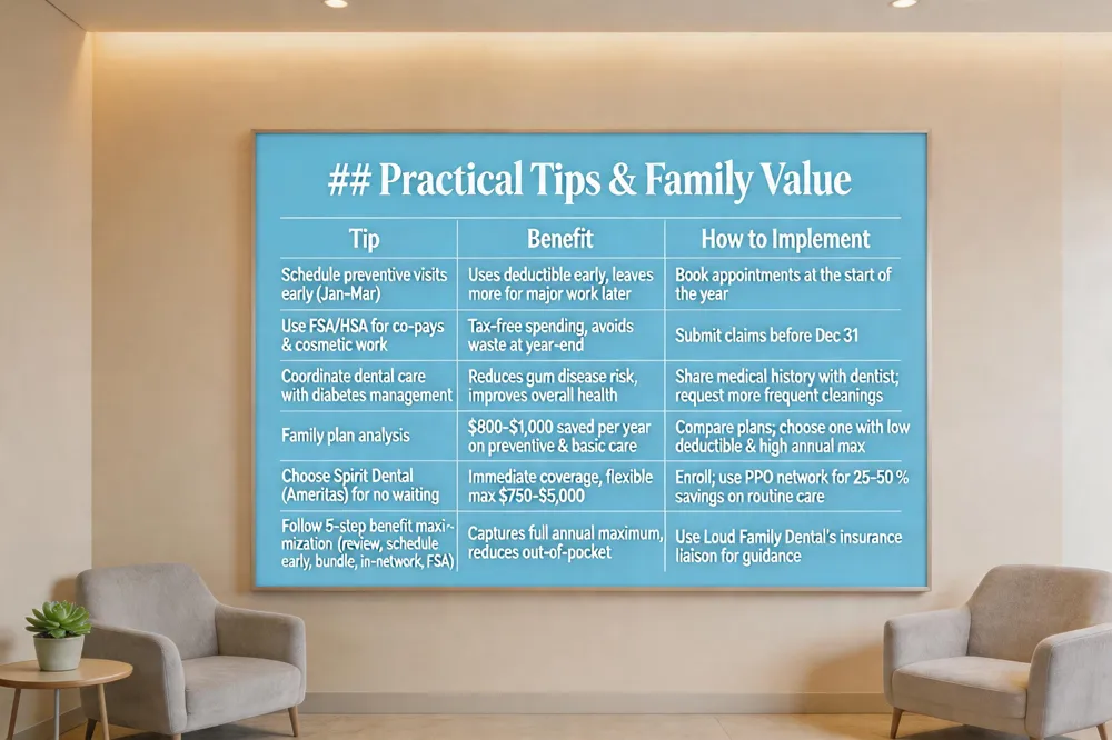 Step‑by‑step benefit maximization – 1) Review your plan’s coverage and annual maximum. 2) Schedule preventive visits early in the year. 3) Bundle basic procedures to use remaining benefits efficiently. 4) Choose in‑network providers like Loud Family Dental. 5) Use a Flexible Spending Account (FSA) for extra tax‑free savings.