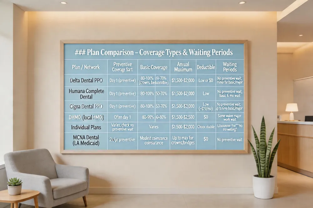 | Full‑coverage dental insurance plans such as Delta Dental, Uniana Dental, and Cigna Dental provide a broad range of services—from preventive cleanings to crowns, bridges, root canals, and sometimes orthodontics or implants—typically with an annual maximum of $1,500‑$2,000 and low or no deductible. Many plans start covering preventive care on day one, so you can schedule a cleaning, exam, fluoride treatment, and X‑rays right after enrollment. This immediate coverage is common in Humana’s Complete Dental plan and Delta Dental PPOs, while some DHMO options even waive waiting periods for major work. Individual dental insurance, purchased outside of employer groups, lets you choose coverage level, deductible, and maximum that fit your budget; Cigna’s low‑deductible plans start around $19 per month, offering up to $1,500‑$3,000 in benefits. For families who want no waiting period at all, look for plans that explicitly state “no waiting for preventive services” and confirm in‑network status with your dentist. In Louisiana, the most widely‑recommended options are the large PPO networks—Delta Dental, Humana, and Cigna—because they have extensive Shreveport provider rosters and reasonable annual maximums. For Medicaid recipients, MCNA Dental is often favored over DentaQuest due to its URAC/NCQA accreditation and added perks like a $10 Amazon gift card, while both deliver the state‑mandated EPSDT benefits for children and limited adult services. |