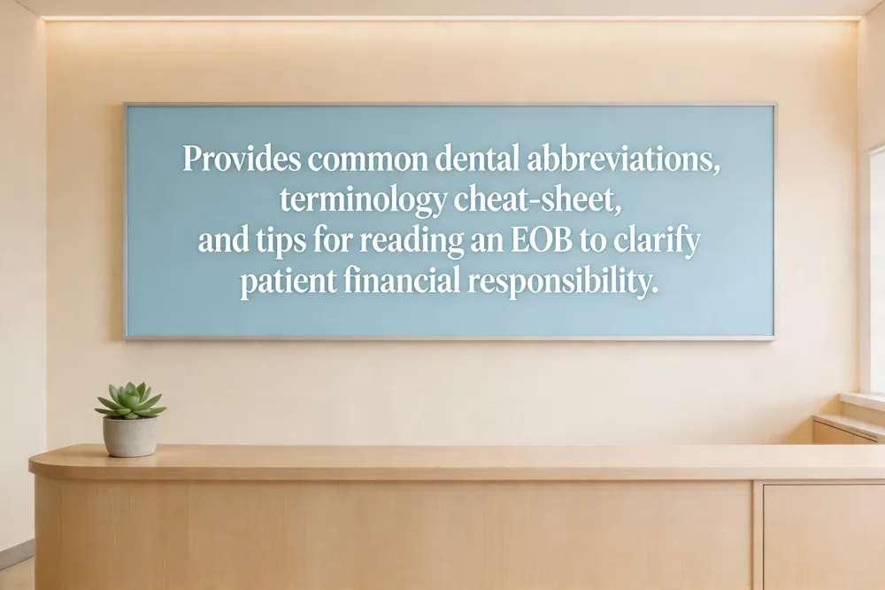 Front‑desk staff should master common appointment abbreviations—NP (new patient), FMX (full‑mouth X‑rays), BW (bitewing), VBW (vertical bitewing), PA (periapical), PAN (panoramic). Basic hygiene terms include Prophy (prophylaxis cleaning), SRP (scaling and root planing), and Perio (periodontal disease). Knowing insurance language—co‑payment, deductible, coverage, balance billing, and maximum plan benefit—helps explain financial responsibilities. Simple anatomy words (enamel, dentin, pulp, gingiva, crown, root) make it easier to describe procedures.