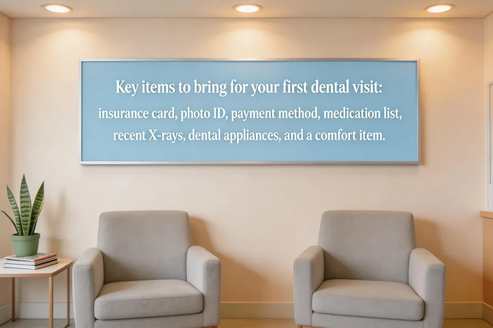 Answer to the key question: Bring your completed intake forms (or be ready to fill them out), a valid photo ID, dental insurance card(s), a list of current medications, any dental appliances, recent X‑rays or records, and a method of payment. Adding a comfort item can make the visit smoother for you or your child.