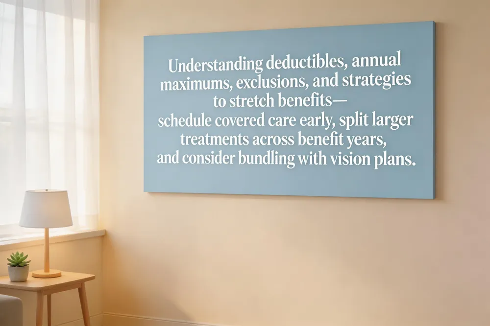Understanding your plan’s annual maximum and deductible is the step. Most policies cap benefits at $1,000–$2,000 per year; exams, cleanings and X‑rays often count toward this limit. The deductible (e.g., $50) must be paid before coinsurance applies—if a $250 filling follows a $50 deductible, you owe $50 plus 20 % of the remainder. Services excluded include adult orthodontics, cosmetic whitening, implants unless medically necessary, over‑the‑counter products, and experimental procedures. To stretch benefits, schedule all fully covered care early, break larger restorations into two benefit years, and treat minor issues promptly. The “Rule of 7 and 3‑3‑3” reminds patients to see a dentist every six months, keep three cleanings per year, and replace toothbrushes quarterly. When bundling dental and vision, compare carriers such as Delta Dental + VSP, UnitedHealthcare, or Cigna for premiums, maximums, and coverage.